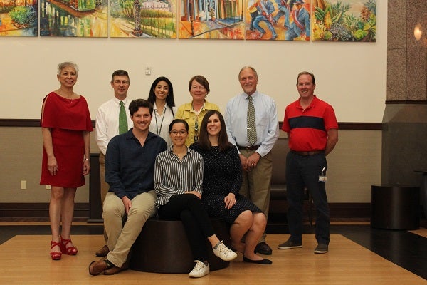 Back row, faculty advisors: Dr. Maureen Lichtveld, Dr. John Schieffelin, Dr. Claudia Herrera, Dr. Dawn Wesson, Dr. Richard Oberhelman, and Dr. Jeffrey Wickliffe. Front row, Fogarty Global Health Fellows: Matthew Ward, Lissa Soares, and Monika Dietrich.